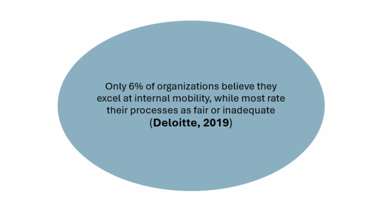 - Only 6% of organizations believe they excel at internal mobility, while most rate their processes as fair or inadequate (Deloitte, 2019).